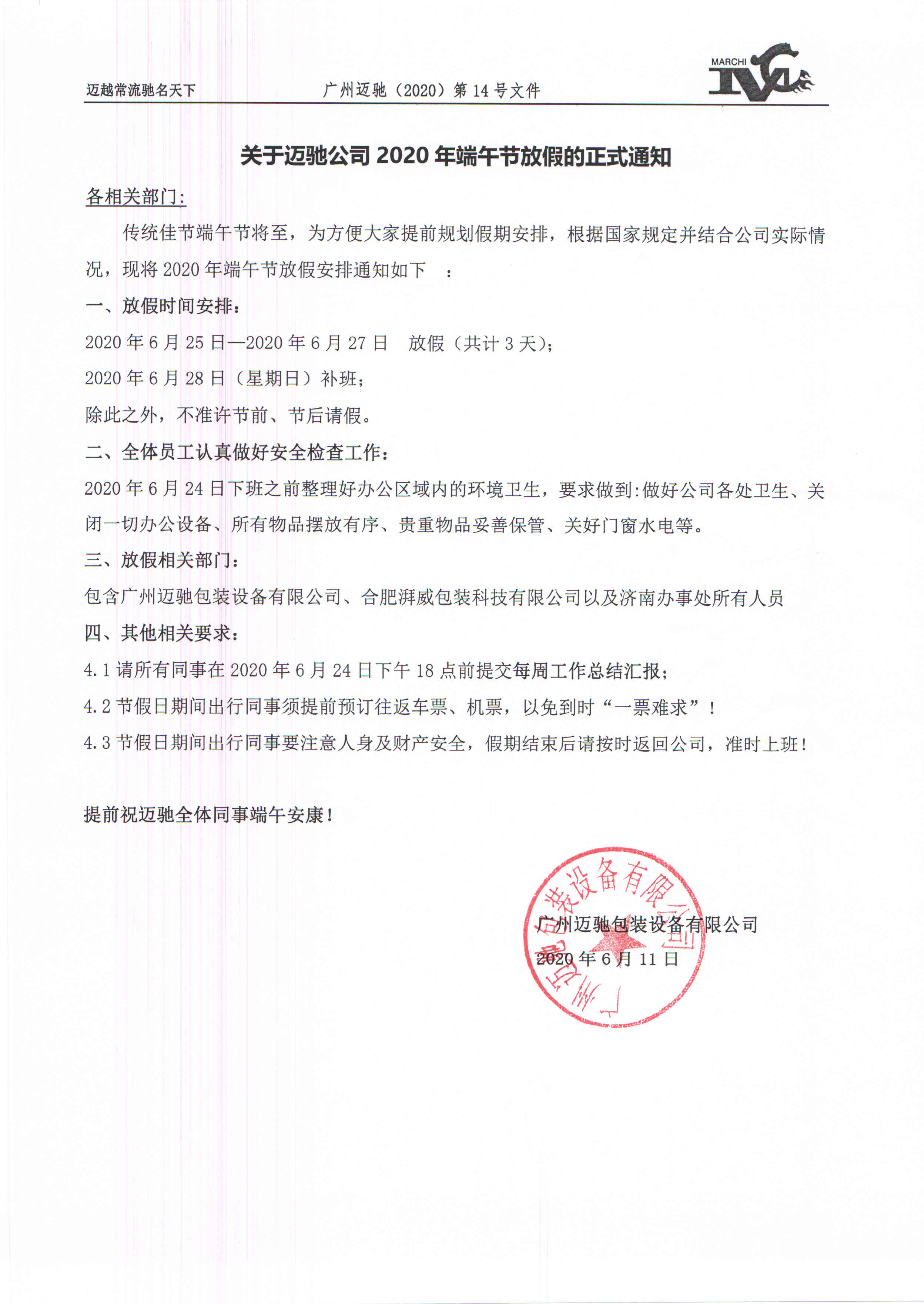 又到了一年一度的端午假期,廣州邁馳也是為公司的小伙伴發(fā)了端午大禮包,下面是廣州邁馳今年的放假通知。提前祝大家端午節(jié)快樂。